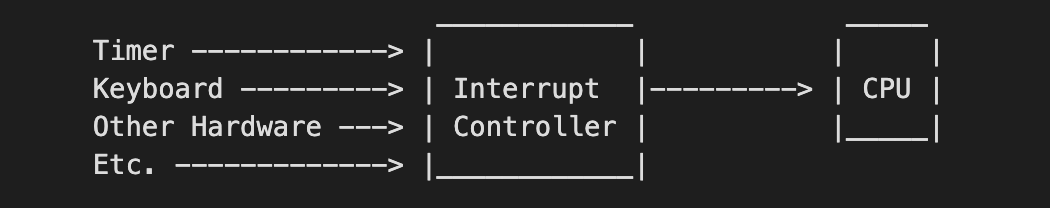 而是由一个单独的中断控制器汇总来自所有设备的中断,然后通知CPU: