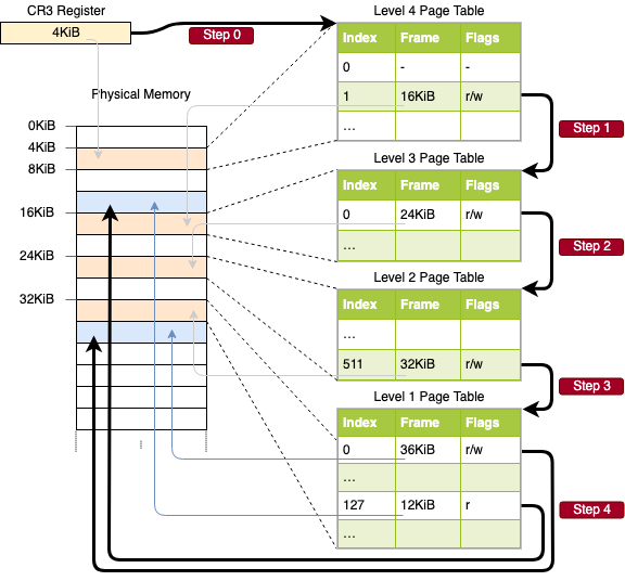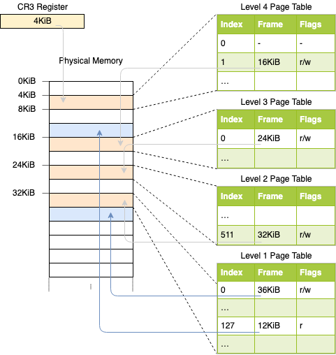 当前活动的4级页表的物理地址(4级页表的根)存储在CR3寄存器中。然后,每个页表条目都指向下一级表的物理框架。然后,级别1表的条目指向映射的帧。注意,页表中的所有地址都是物理的而不是虚拟的,因为否则CPU也需要转换这些地址(这可能会导致无休止的递归)。