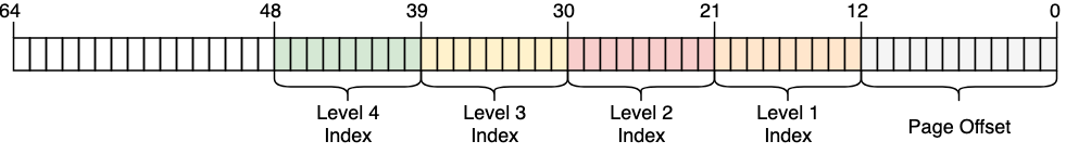 值得注意的是,最近的“冰湖”英特尔CPU可选地支持5级页表,将虚拟地址从48位扩展到57位。考虑到在这个阶段为一个特定的CPU优化内核是没有意义的,在本文中我们将只使用标准的4级页表。