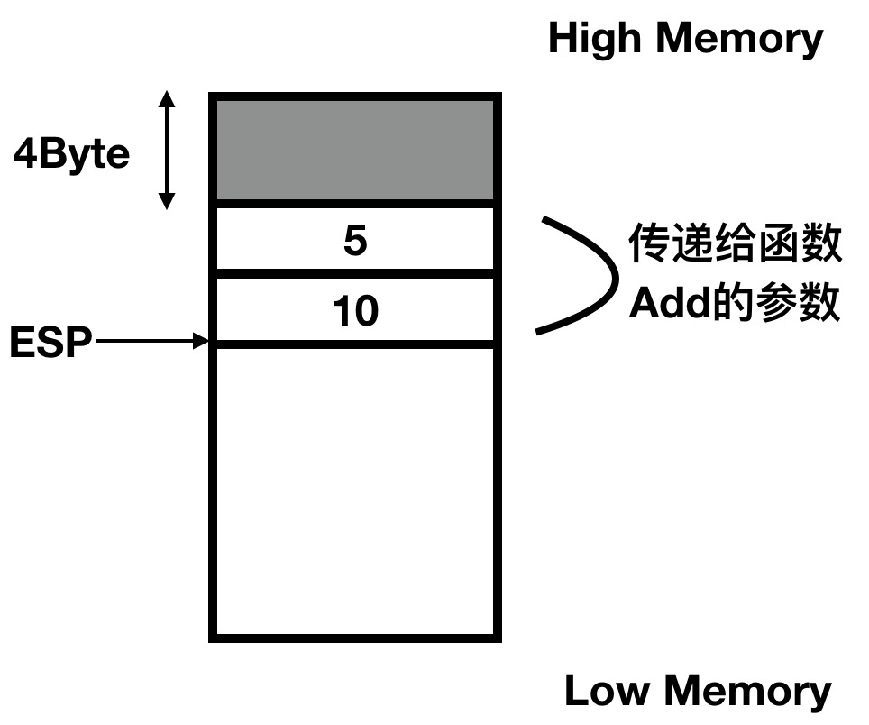 首先将5和10两个参数压入栈,同时更新ESP指针的值,如下图所示: