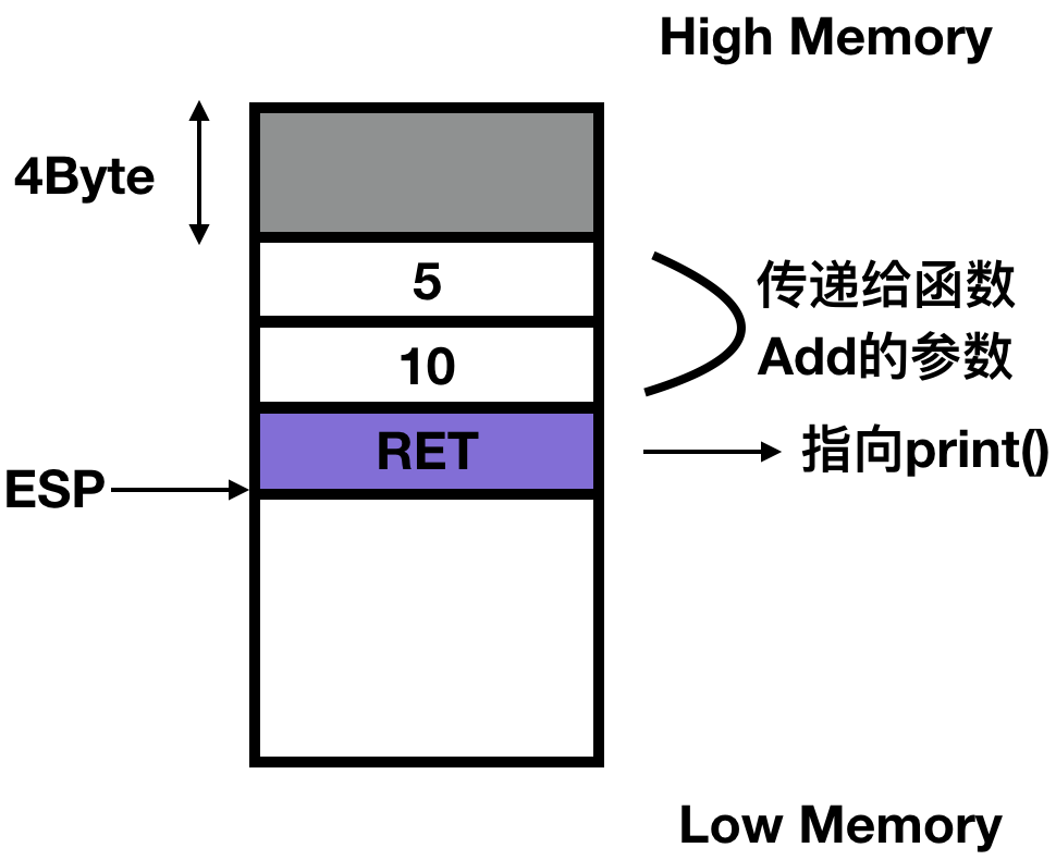当Add函数调用执行完毕之后,我们需通过某种方式返回到main函数中继续执行下面的指令,在本例中也就是执行print函数。解决这个问题的方式就是将下一条指令的地址压入栈中: