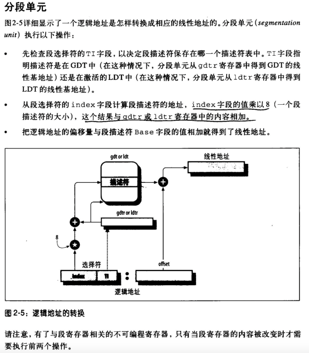 程序过来一个逻辑地址,使用其段标识符(也即段选择符)的Index字段去索引段描述符表,若TI=0,索引全局段描述符表,TI=1,索引局部段描述符表,表的地址在相应的寄存器中。通过Index字段和段描述符表的位置能找到某项具体的段描述符。将段描述符中的base字段和逻辑地址中的offset字段合并即得到了线性地址。